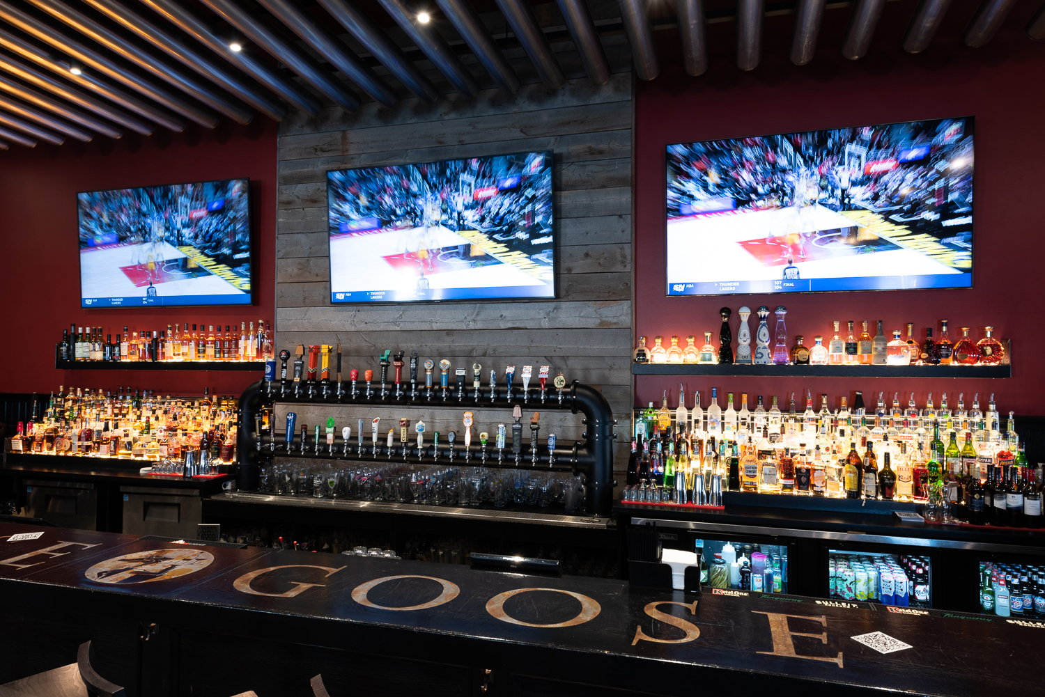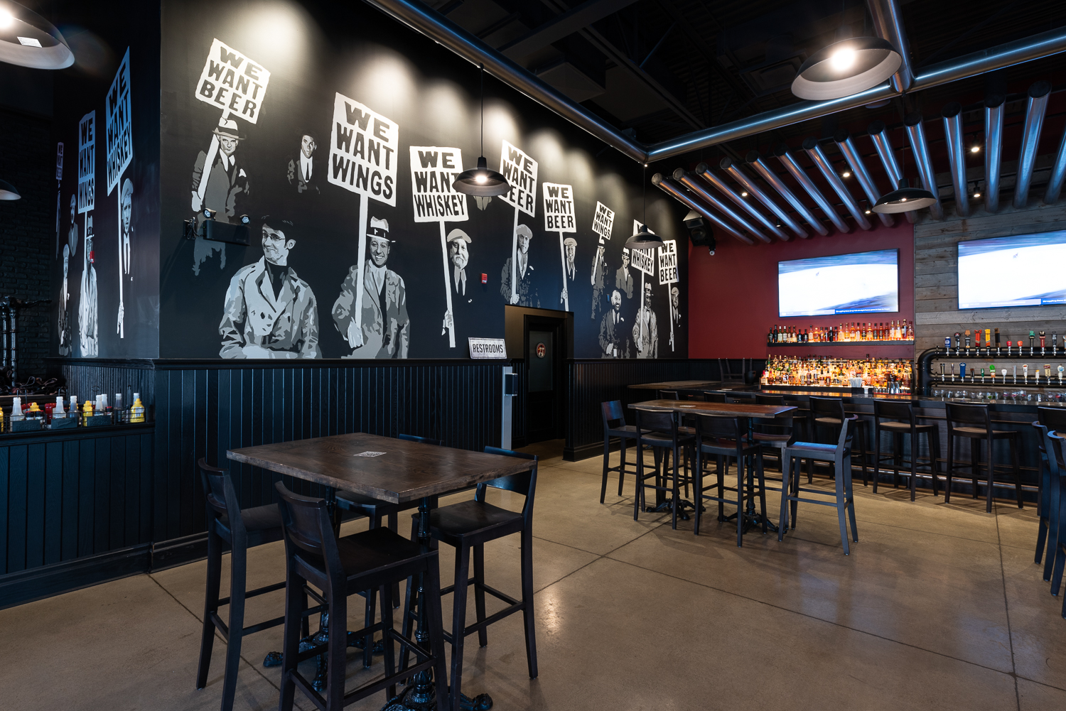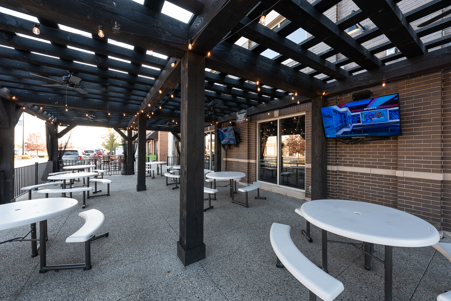 This building features numerous large format TV’s, table and booth seating, and a “beer tower” with 40 beers on tap.